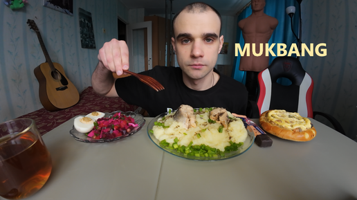 МУКБАНГ ПЮРЕ И РЫБА (ГОРБУША) / САЛАТ ВИНЕГРЕТ / ПИРОГ РЫБНЫЙ / БАТОНЧИК ШОКОЛАДНЫЙ / ЕДА / АСМР