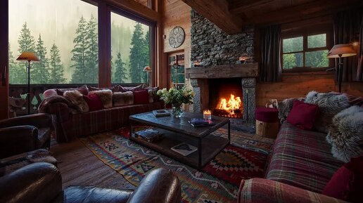 Уютное видео: комната для отдыха в домике под звуки дождя и камина.