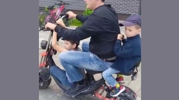 Катаемся на скутере у дома втроём: папа, я и братик Дима.
