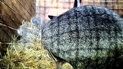 Крольчиха надирает с себя пух для гнезда