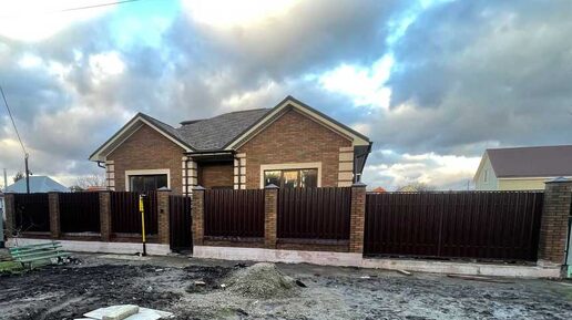 Забор ул. Дзержинского из евроштакетника с кирпичными колоннами и основанием.