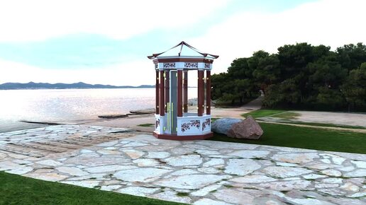 Беседка на могилу с колоннами из гранита Шокша и невысоким забором из мрамора Коелга с гравировкой веток де440