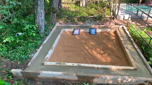 Памятник-валун с оградой из нержавейки с цветником и галтованной брусчаткой на участке на кладбище
