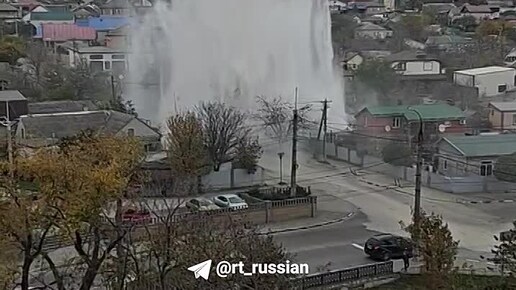 В Новороссийске из-за прорыва трубы появился огромный фонтан. Вода льётся прямо на крыши домов