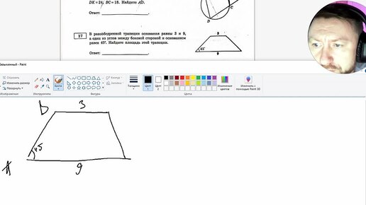 Решение задачи 17 из билета ОГЭ, геометрия. Найти площадь равнобедренной трапеции.