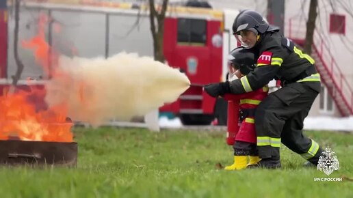 Папа огнеборец учит ребенка обращаться с огнетушителем