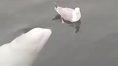 Белуха угощает чайку рыбой в норвежском центре реабилитации китов...