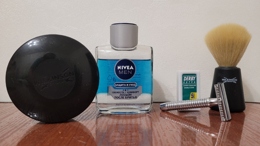 Станок Луч (СССР) с лезвиями Derby extra, мыло и помазок Wilkinsonsword, лосьон Nivea
