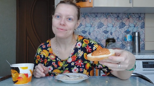 Завтрак, мукбанг, каша и бутерброд с куриной колбасой и с чаем, не заработала