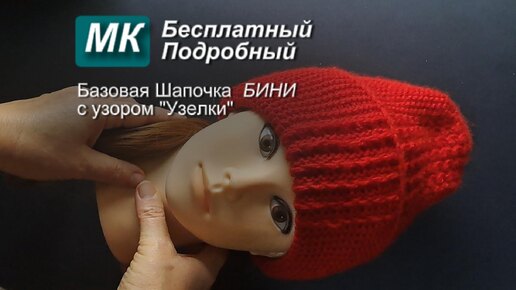 Базовая шапочка Бини с узором "Узелок" с удлинённой макушкой, вяжем спицами ❤️🧶 Бесплатный МК.