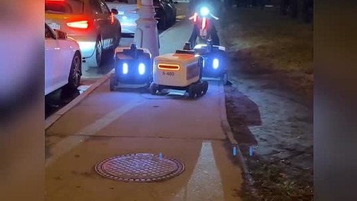 Человек-курьер попал в пробку из-за роботов-курьеров, которые долго не могли разъехаться.