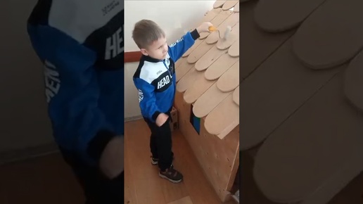 Ребенок красит валиком крышу у дома