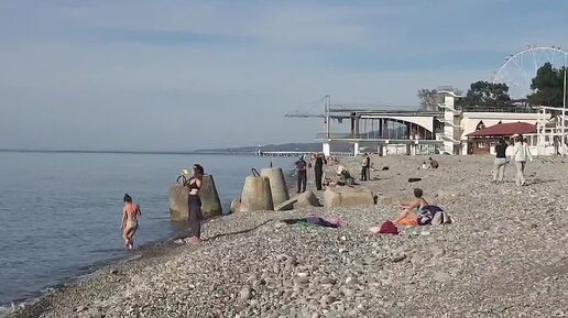 Полдень, воздух +21 С, вода +17 С. Море, дельфины, пляж Багратион. Купаются даже дети. Лазаревское Сочи. 22 ноября 2025