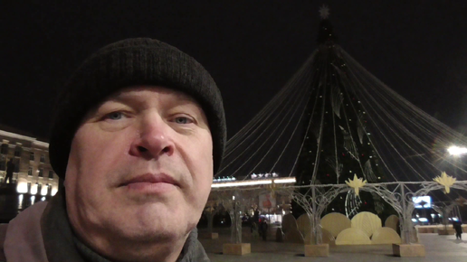 Геннадий Горин вечером на площади Ленина. Новогодняя ёлка. Дед Мороз и Снегурочка
