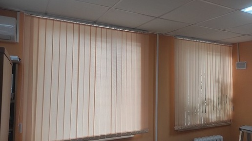 Вертикальные жалюзи персикового цвета для оформления оконных проемов в офисном помещении. В стиле и цвете офиса.