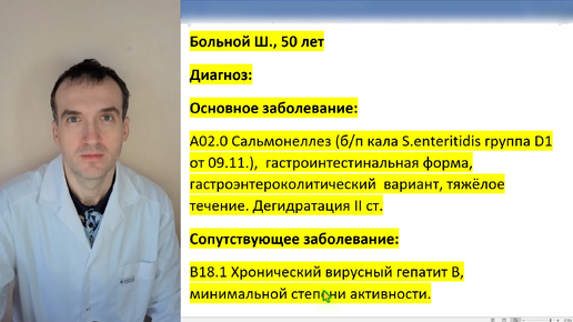 Больной Ш., 50 лет - Сальмонеллез (б/п кала S.enteritidis группа D1), гастроэнтероколитический вариант, тяжелое течение. Дегидратация II ст.