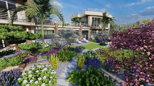 Ландшафтный дизайн участка 15 соток в Сочи. Хай-тек и Пейзажный стиль