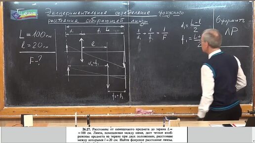 Задача на определение фокусного расстояния линзы по известному расстоянию от освещенного предмета до экрана