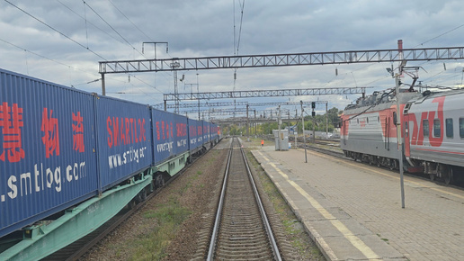 из окна поезда | станция Придача на ходу | контейнерный и прибывающий пассажирский