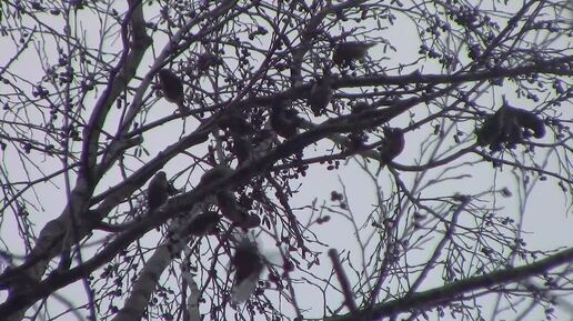 Стайка чижей в ноябрьский день, едят ягоды, чирикают, пугаются