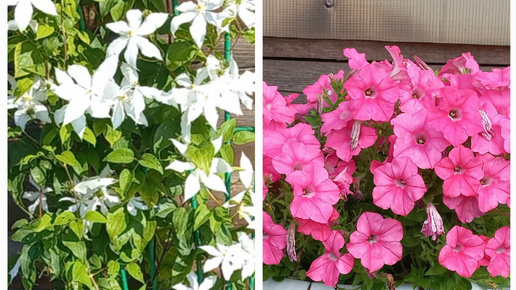 Петунии и клематис в саду 2025