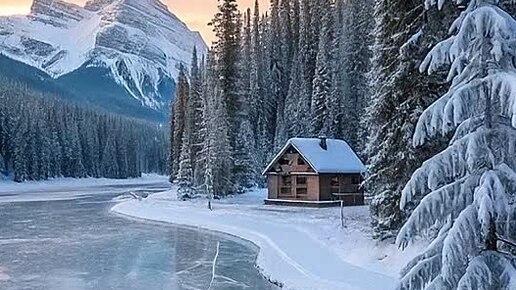 дом озеро зима лёд снег вид (о)