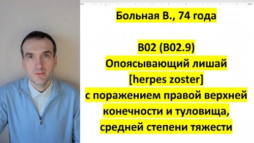Больная В., 74 г. - Опоясывающий лишай [herpes zoster] с поражением правой верхней конечности и туловища, сред.ст. - B02 (B02.9)