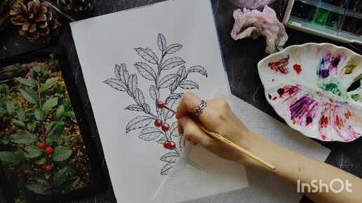 Мастер-класс по рисованию веточки падуба линерами и акварелью