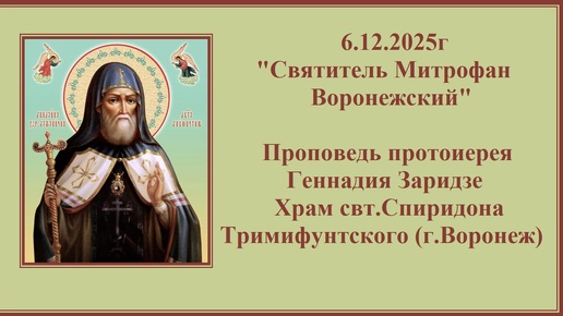 6.12.2025г "Святитель Митрофан Воронежский" Проповедь протоиерея Геннадия Заридзе. Храм свт.Спиридона Тримифунтского (г.Воронеж)
