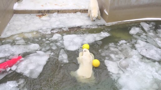 Белка заталкивает шары под льдину. 04.12.2025
