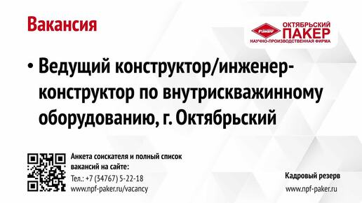 Вакансия ведущий инженер-конструктор НПФ Пакер г. Октябрьский