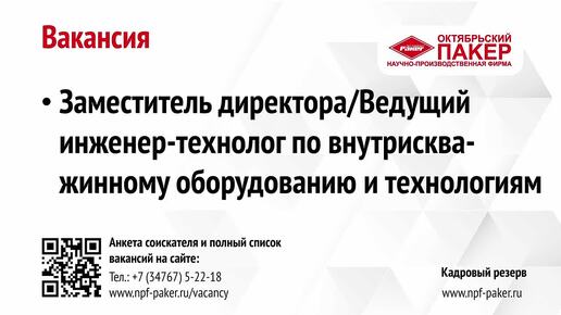Вакансия Заместитель директора - ведущий инженер-технолог НПФ Пакер