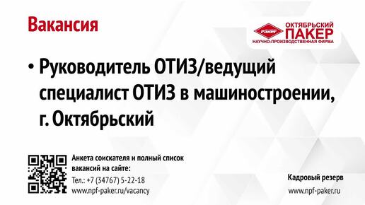 Вакансия руководитель ОТИЗ г. Октябрьский НПФ Пакер