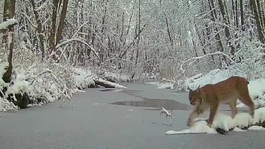 Рысь поняла, что лед слишком тонкий, и решила добраться до берега по воздуху. Иногда стоит подойти к ситуации с другой стороны.