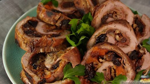 Снаружи сочно, внутри сладко. Рулет из свинины с сухофруктами