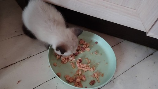 Варин котенок первый раз самостоятельно ест новую еду