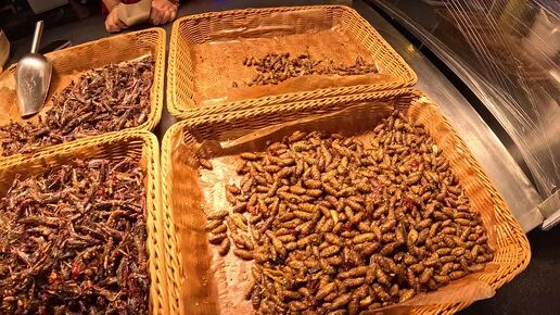 Ночная улица еды и ночной рынок в Санья, Хайнань. Большой обзор улицы еды в Санья, Китай. Большой обзор.
