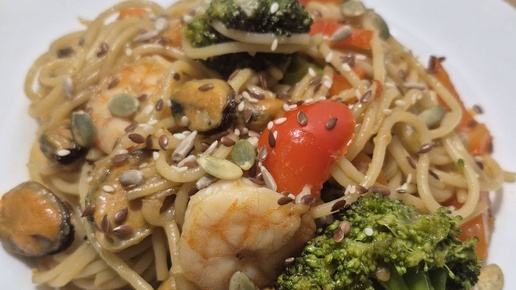 Паста с овощами и морепродуктами