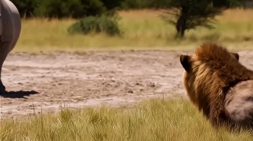 Лев хочет напасть на носорога