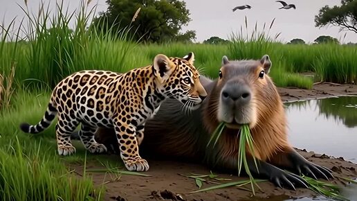 Молодой ягуар и капибара