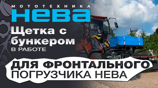 Минипогрузчик НЕВА с щеткой с передним бункером с системой орошения и угловой щеткой в работе