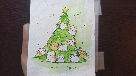 Рисунок акварелью / Елка украшенная котиками