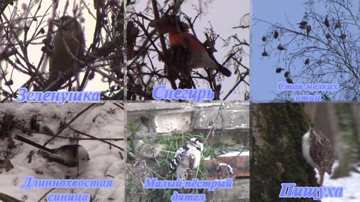 Мелкие зимние птицы, зеленушка, снегирь, длиннохвостые синицы, малый пёстрый дятел, пищуха, а также стайка неопознанных птиц