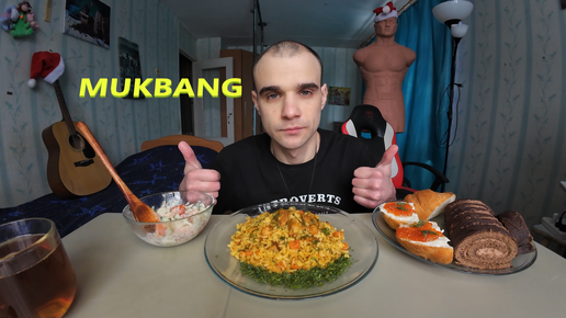 МУКБАНГ ПЛОВ С КУРИЦЕЙ / САЛАТ ОВОЩНОЙ / БУТЕРБРОДЫ С КРАСНОЙ ИКРОЙ / ШОКОЛАДНЫЙ РУЛЕТ / ЕДА / АСМР