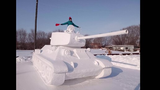 Полноразмерный танк Т-34-85 слепил из снега житель Амурской области с внуком