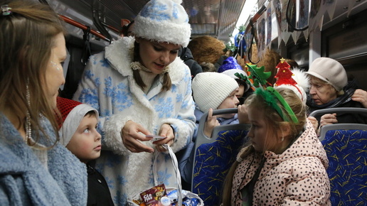 В волгоградском метротраме прокатились Дед Мороз, Снегурочка и Чебурашка: ВИДЕО