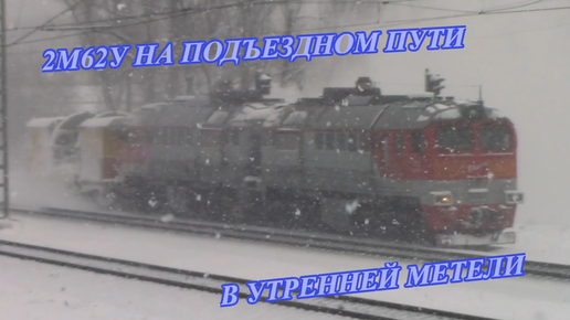 Тепловоз 2М62у на подъездном пути с пневмоочистительной машиной, в снежной метели