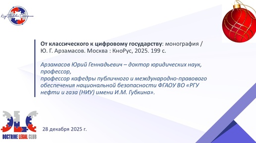 Профессор Ю.А.Арзамасов представляет новую монографию "От классического к цифровому государству" и поздравляет с Новым годом песней