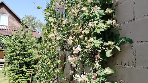 Жимолость Каприфоль (Lonícera caprifólium) на стене гаража. Наш сад 2025