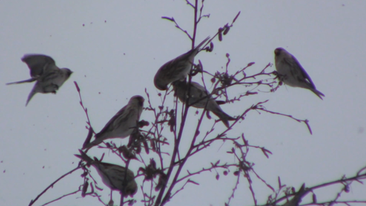 Птицы чечётки на верхушке берёзки, кормятся семенами и летают